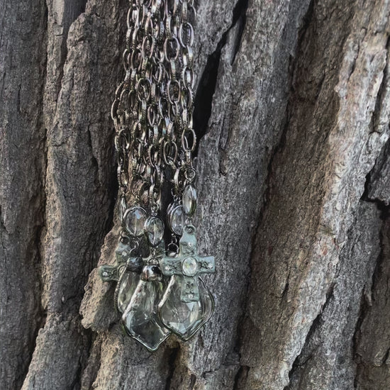 Indulge in the captivating beauty of our meticulously designed dream necklace, adorned with a stunning faceted crystal pendant. The oxidized heavy silver link chain exudes an air of timeless luxury, making it the ultimate statement piece to elevate any ensemble. This radiant creation allows you to illuminate the world with your inner light. Whether worn alone to command attention or layered for an added touch of allure, this necklace encapsulates unparalleled beauty and sophistication.