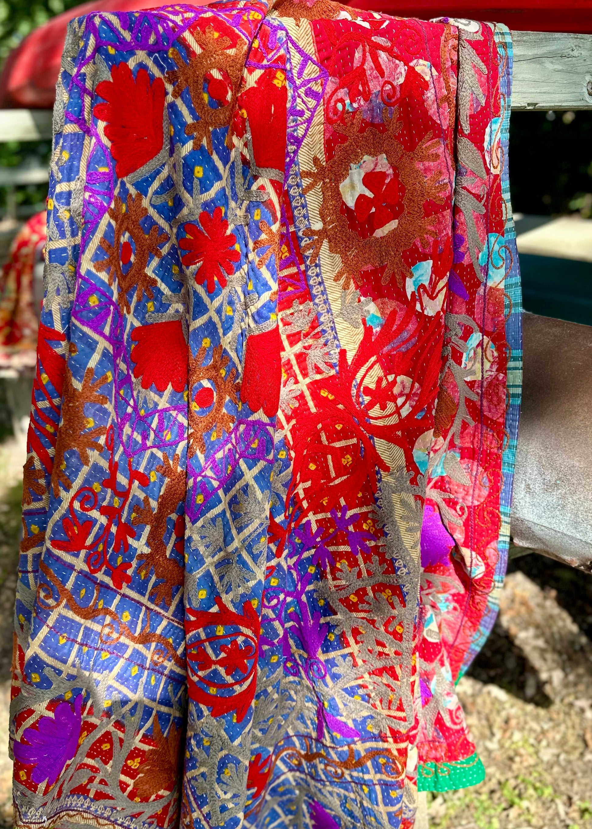 Rowena Reversible Embroidered Kantha Quilt. - Blue Red Purple